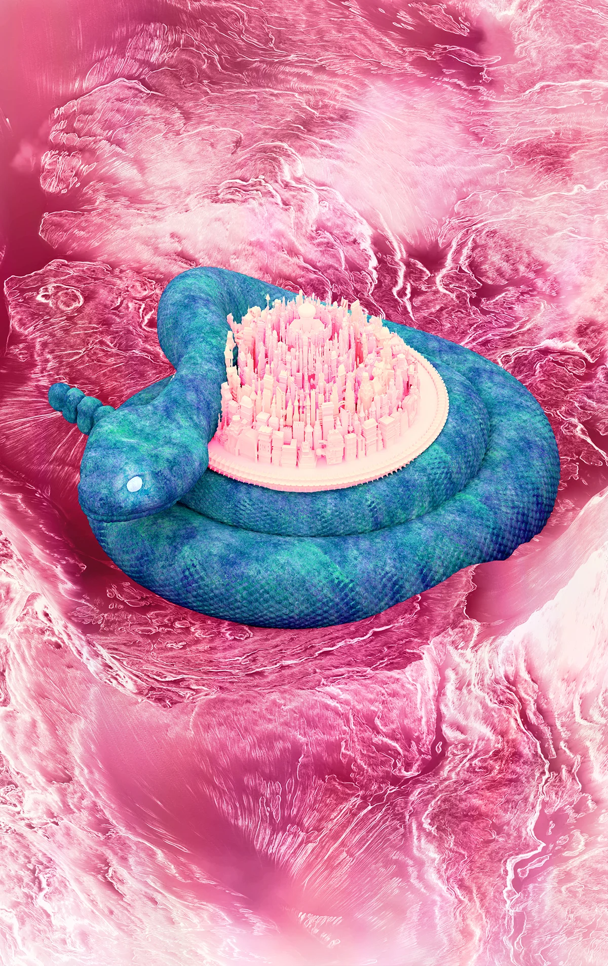 The Third, seeking efficiency for an arid and sandy climate, took the form of a simple yet versatile legless being that could curl or unfurl for displacement or delight. It improved on the design of the First’s scaly skin, by sheathing itself entirely in individual scales that would serve as protection but become renewed through an annual molting process governed by the Second’s seasons. As for a gift, thinking neither milky rain nor seeded plantings would be too common in the deserts, the Third decided to birth its gift in the form of thousands of different eggs that could be eaten for nourishment or raised as various species of “animals.”